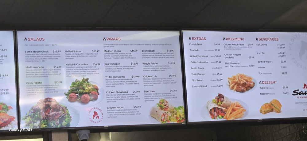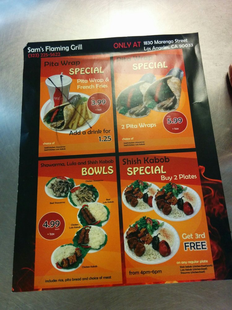 Welcome to Sam's Flaming Grill, a hidden gem nestled in Los Angeles. This casual Mediterranean eatery celebrates vibrant flavors through its diverse menu, perfect for any meal. Each dish showcases freshness, especially the renowned Chicken Kabob and Beef Shawarma plate combos, consistently praised for their quality and generous portions. The warm, welcoming atmosphere complements the delightful experience, making it ideal for families, groups, or a quick lunch break.